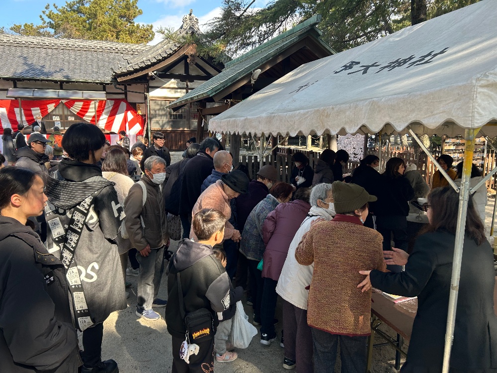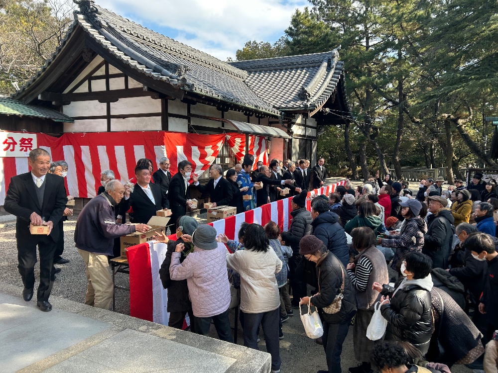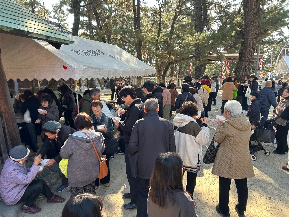 節分祭は、暦の上で春が始まる「立春」の前日に、一年間の厄を払い、福を呼び込むために行われる神事です。一般的には、豆まきは家の内から玄関に向かってまき、最後に戸を閉めて福を閉じ込めます。大濵熊野大神社の節分祭は11時から神事が執り行われ、その後に神社関係者が豆まきをして、お汁粉を振る舞います。